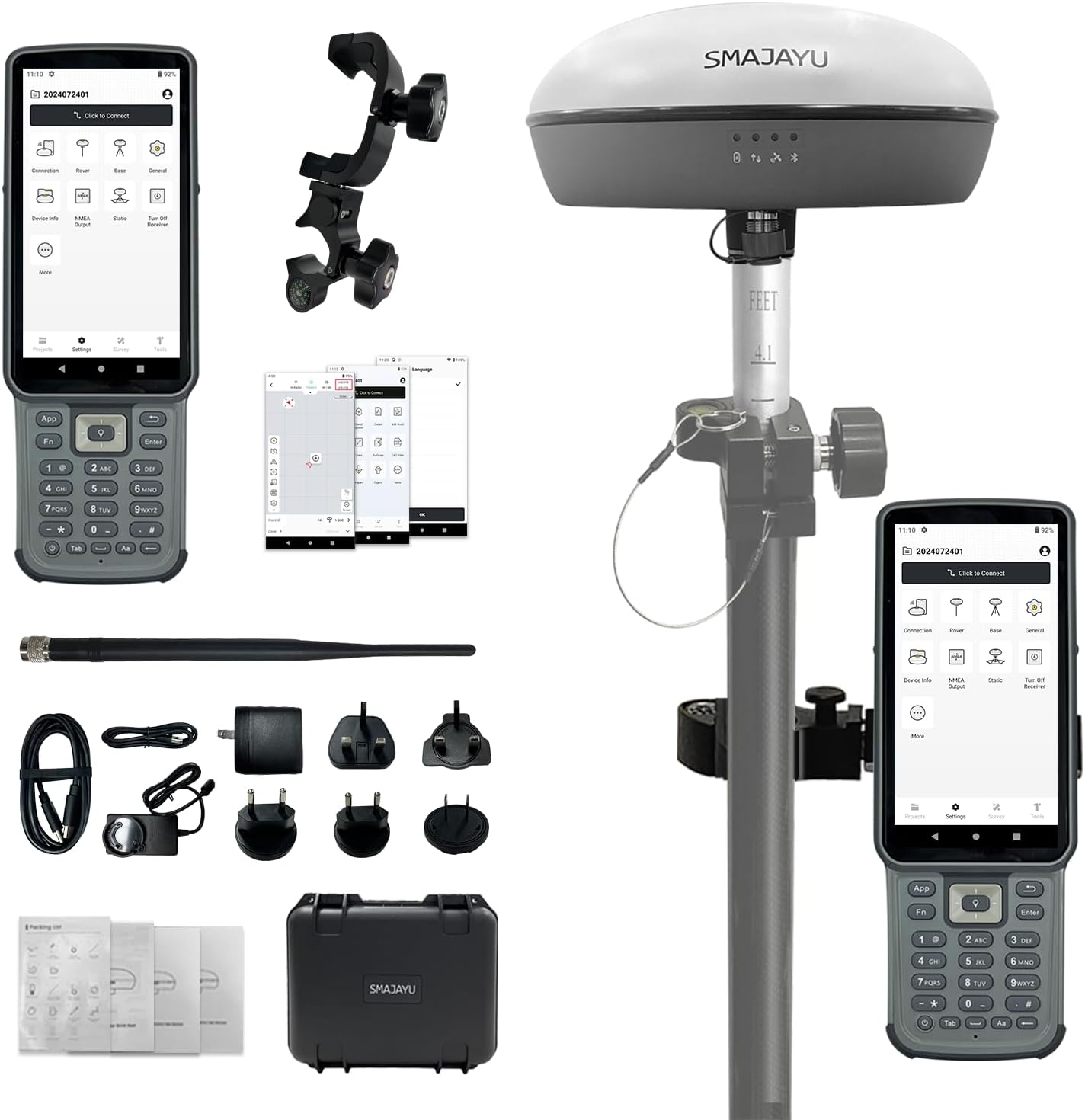 【Wide Protocol Compatibility】 Capable of sending and receiving signals compatible with CSS(Lora),Transparent, TT450S,Trimtalk,TRMMARK3, SOUTH, SATEL standard radio protocols; 5-10 km typically;Under ideal conditions, the maximum distance can reach 15km 【Tilt Compensation】 2.5cm tilt accuracy (≤30°) with no calibration needed, enabling precise measurement in hard-to-reach areas,Tilt measurement max upto 60° 【High Capability & Compatibility】 The SMA26 Plus is an full-constellation RTK GNSS receiver with wide protocol compatibility, making it compatible with multiple RTK brands. Supporting PPP, PPK, and RTK technologies, it delivers versatile, high-precision performance for a wide range of surveying applications 【Smart Handheld Collector】Android 11 handheld with 5.45" HD screen, dual SIM, 9000mAh battery, NFC, IP68 protection, dual-band RTK support, and 13MP rear camera 【All-in-One Integration】 Built-in Bluetooth, UHF radio, WiFi, IMU, antenna, and 32GB storage. Easily switch between base station and rover mode with one device 【Rugged & Reliable】 IP67 waterproof, dustproof, 2m drop resistance. Operates in -45℃ to +75℃. Up to 20 hours rover use with 10000mAh battery