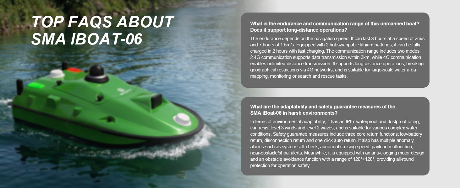 The SMA iBoat-06 Is A Highly Integrated, Lightweight Unmanned Surface Vehicle, Engineered For Rapid Deployment In Bathymetric Surveying, Environmental Monitoring, And Emergency Response. We Combines Advanced Sensors, Artificial Intelligence, And Reliable Communication Technologies In A Professional Platform To Make Sure Work Efficiency And High Accuracy.