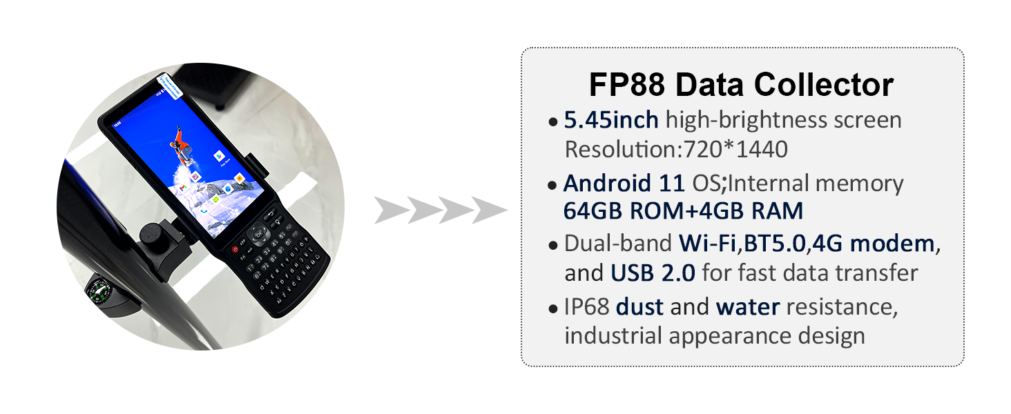【Tilt Compensation】 2.5cm tilt accuracy (≤30°) with no calibration needed, enabling precise measurement in hard-to-reach areas 【Smart Handheld Collector:】Android 11 handheld with 5.45" HD screen, dual SIM, 9000mAh battery, NFC, IP68 protection, dual-band RTK support, and 13MP rear camera 【High-Precision GNSS System】Includes SMA26 RTK receiver + Android handheld with survey software. Achieves ±8mm RTK horizontal accuracy and 2.5cm tilt measurement precision 【All-in-One Integration】Built-in Bluetooth, UHF radio, 4G, WiFi, IMU, antenna, and 32GB storage. Easily switch between base station and rover mode with one device 【Rugged & Reliable】IP67 waterproof, dustproof, 2m drop resistance. Operates in -45℃ to +75℃. Up to 20 hours rover use with 10000mAh battery