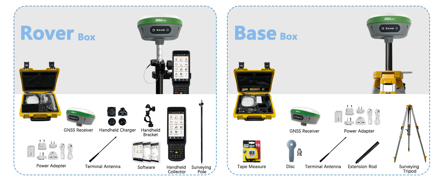 SMA26 GNSS Surveying System with IMU, consists of SMA26 rover and base station and Collector with Surveying software. Double SMA26 RTK GNSS receiver included, which enables the system to pinpoint measurement and reference locations in a timely and accurate manner.